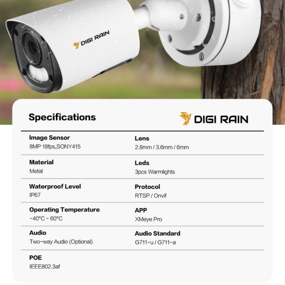This **4K 8MP Bullet IP Camera** offers exceptional video quality, ensuring that every detail is captured with **8MP resolution**. Its **full-color night vision**, **intelligent detection** features, and **IP67 waterproof rating** make it an excellent choice for both **indoor and outdoor surveillance**. With **POE** capability, it simplifies the installation process, requiring only one cable for both **power** and **data transmission**.