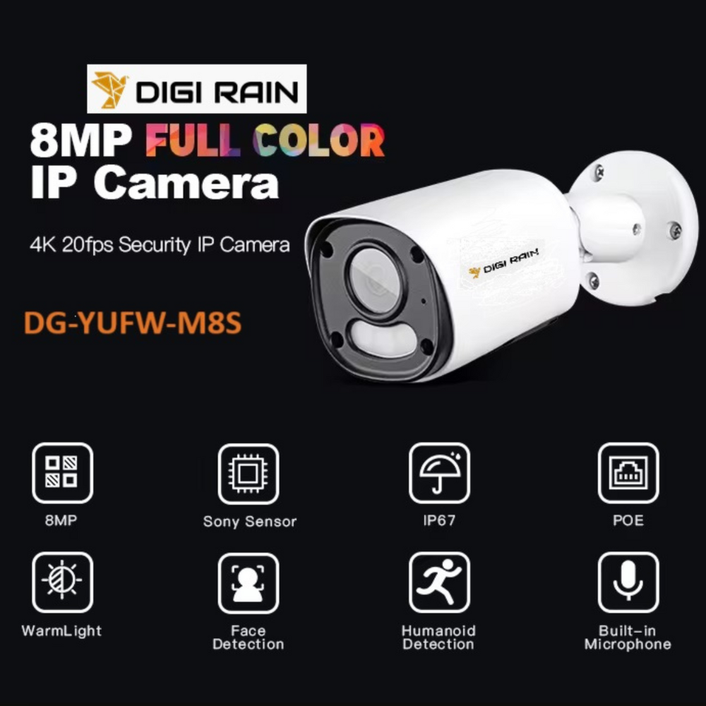 The **4K 8MP Bullet IP Camera** is an advanced **security camera** that delivers **8MP (3840×2160) resolution** at **30FPS**, offering superior image quality. Equipped with **POE (Power over Ethernet)** and **H.265 compression**, this camera is perfect for **outdoor and indoor use** with its **IP67 waterproof rating**. It features **full-color night vision** with up to **30m infrared range**, ensuring clear visibility even in low light conditions. With **motion detection**, **face detection**, and **humanoid detection**, this camera enhances security by identifying and alerting for potential threats.